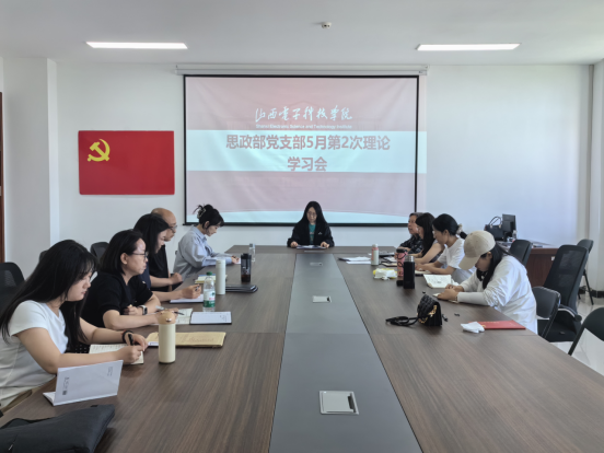 2025年5月20日下午4点-6点,思政部党支部在15A-501会议室召开了理论学习会。本次会议由支部负责人宁怡琳同志主持,思政部全体党员参加了会议。会议旨在通过深入学习习近平总书记重要讲话精神和党的重要法规条例,进一步提升党员的理论素养和政治觉悟,推动党支部党建工作高质量发展。