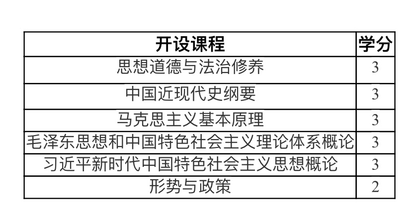 根据《新时代学校思想政治理论课改革创新实施方案》要求,落实立德树人根本任务,发挥思政课程在大学生成长成才中的重要作用,增强学生的使命担当,重点引导学生系统掌握马克思主义基本原理和马克思主义中国化理论成果,了解党史、新中国史、改革开放史、社会主义发展史,认识世情、国情、党情,深刻领会习近平新时代中国特色社会主义思想,培养运用马克思主义立场观点方法分析和解决问题的能力;自觉践行社会主义核心价值观,尊重和维护宪法法律权威,识大局、尊法治、修美德;矢志不渝听党话、跟党走,争做社会主义合格建设者和可靠接班人。我校开设以下思政课程: